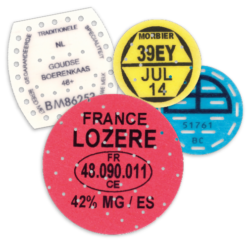 Casein, a milk protein, comes as a powder. It is mixed with water and possibly a coloring agent and glycerol. Subsequently, a film is rolled or pressed from which in a controlled hygienic process the marks are punched, perforated and printed with their own pattern and encoding. The substance takes on water quite slowly, which prevents the marks from sticking together. Perforations ensure that moisture does not accumulate under the cheesemark and so support the adhesion.
